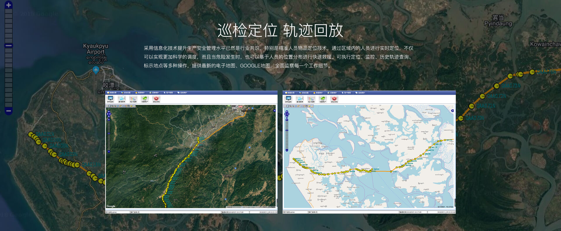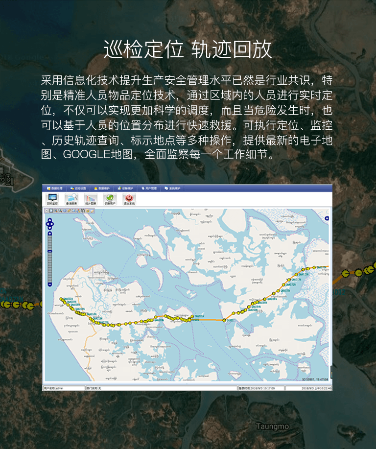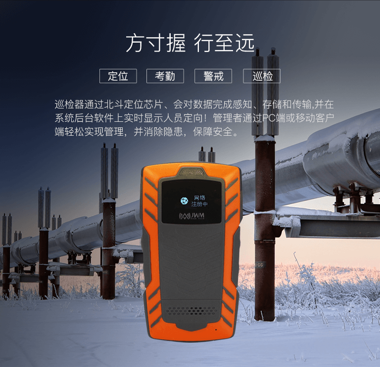 巡檢器通過北斗定位芯片、會對數據完成感知、存儲和傳輸,并在系統后臺軟件上實時顯示人員定向! 管理者通過PC端或移動客戶端輕松實現管理,并消除隱患,保障安全。 產品工業級防爆IP67,無漏檢、免布點、定位精度<5米,定位軌跡回放、4G網絡實時傳輸。 整合管理功能:人員定位、巡檢、考勤、軌跡回放、監督管理等。