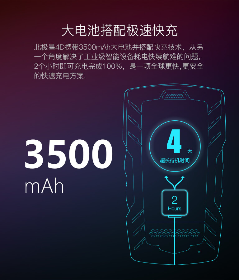 北極星4D攜帶3400mAh大電池并搭配快充技術(shù),從另一個(gè)角度解決了工業(yè)級(jí)智能設(shè)備耗電快續(xù)航難的問(wèn)題,2個(gè)小時(shí)即可充電完成100%,是一項(xiàng)全球更快,更安全的快速充電方案.