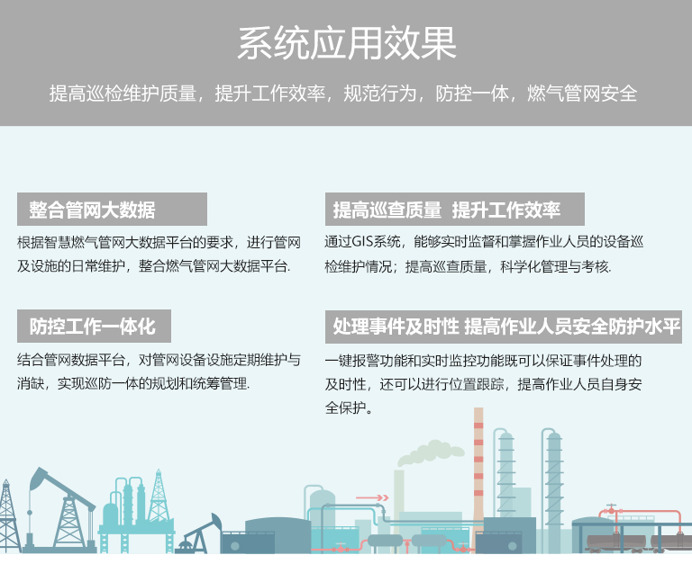 通過(guò)《智慧燃?xì)夤芫W(wǎng)資源管理與巡檢系統(tǒng)》,規(guī)范巡回檢查行為,強(qiáng)化巡查質(zhì)量,及時(shí)消除安全隱患,實(shí)現(xiàn)燃?xì)夤芫W(wǎng)防控工作科學(xué)化、規(guī)范化、智慧化和大數(shù)據(jù)平臺(tái)化的推進(jìn)和實(shí)施,確保燃?xì)夤芫W(wǎng)安全暢通,可靠運(yùn)行。